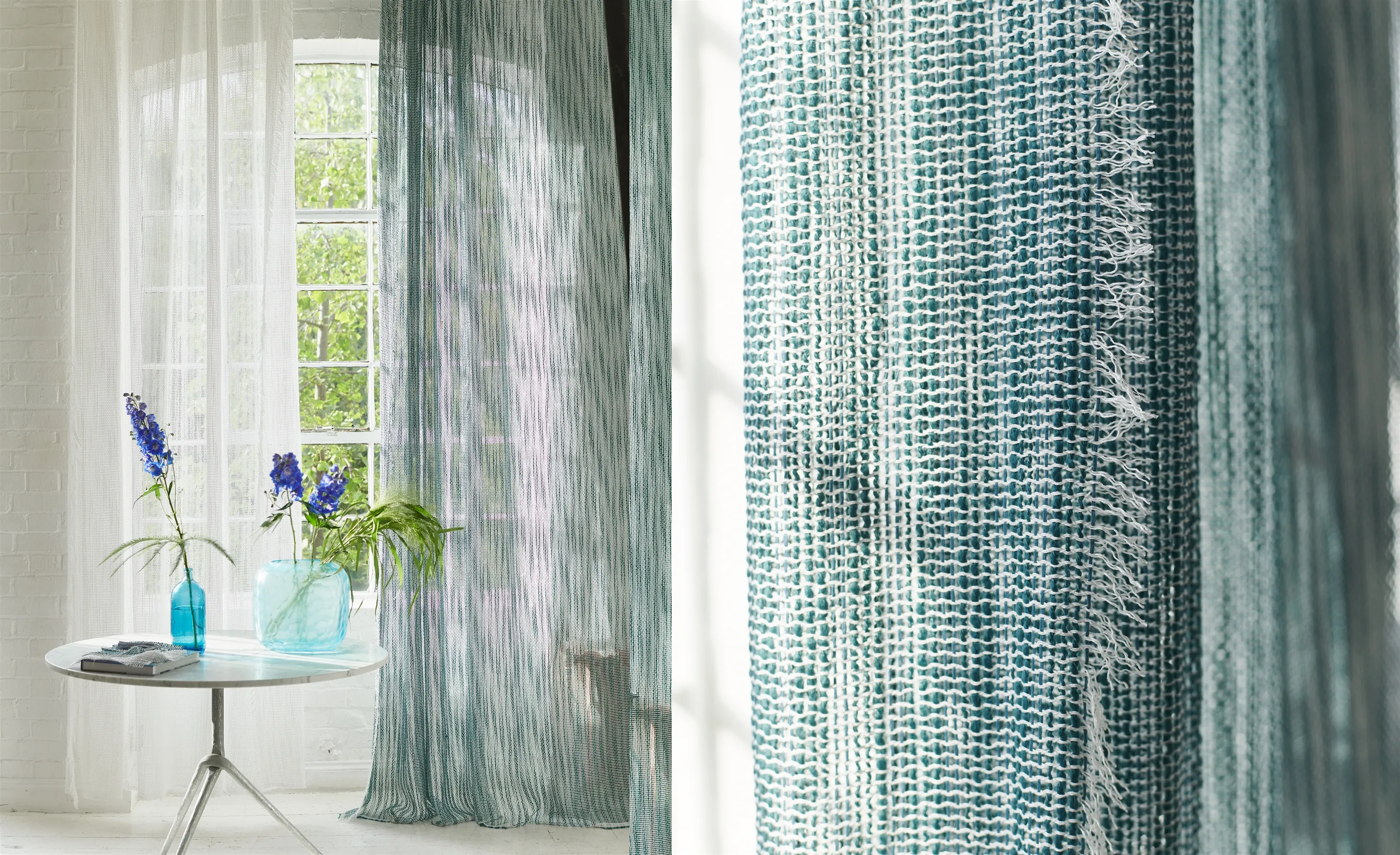 The collection includes two fabrics: Garonne and Bourdon. Garonne is a sheer fabric woven with recycled FR polyester yarn and comes in soft, muted shades. Bourdon is a semi-sheer, open net structured fabric woven with a slubbed Trevira CS yarn for added depth and texture. The fabrics are 315cm wide and feature a weighted hem, are washable, and pass a range of flammability tests. OEKO-TEX® Standard 100 approved for added confidence that no harmful chemicals are used in the production.